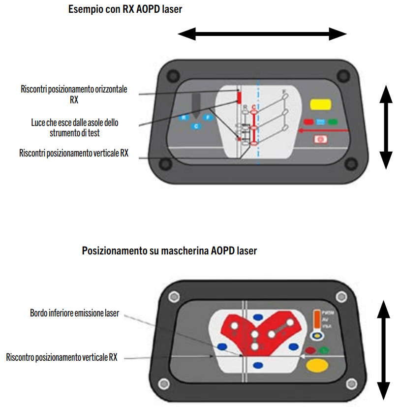 - Spostare orizzontalmente RX in modo tale che la luce si trovi tra i riferimenti per posizionamento orizzontale rx. Si osserverà che il frontale di RX è illuminato da una porzione di luce rossa uscente dalla asola per posizionamento orizzontale RX.
